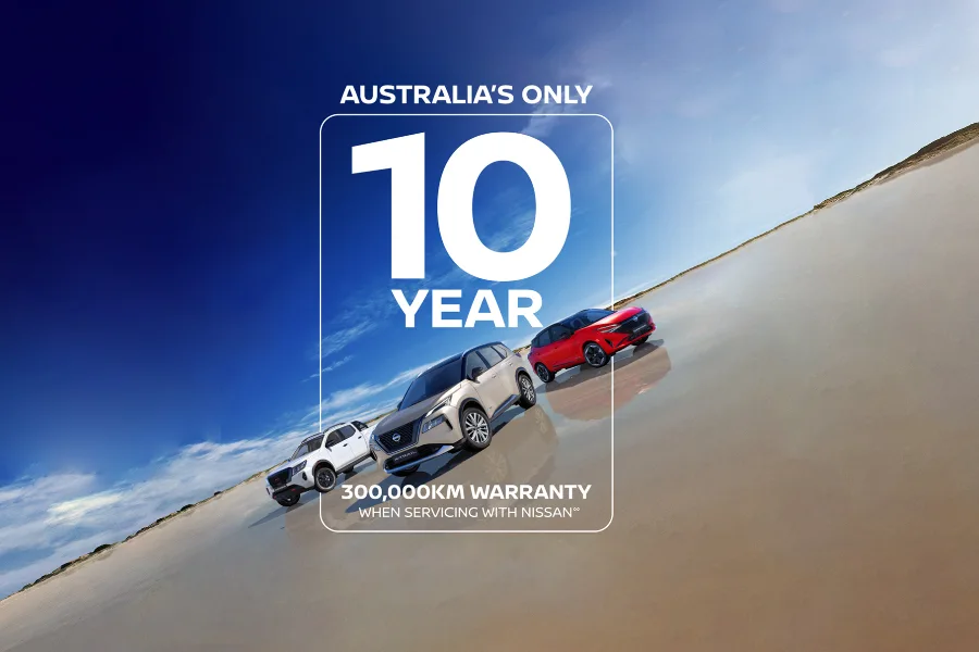 °° Whichever occurs first, when servicing at authorised Nissan dealers. Where vehicle is not serviced through Nissan or ceases to be serviced at Nissan, additional years will not be added so 10 year/300,000km warranty (whichever occurs first) may not apply. Warranty protection will remain 5 year/unlimited km warranty, plus any additional service activated years added under the Plan. Conditions apply. Full terms at Warranty
